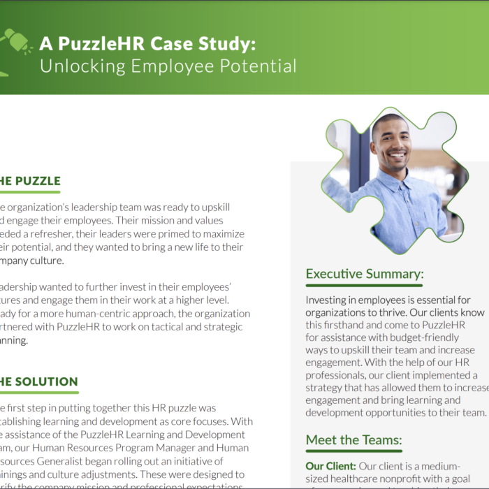 Investing in employees is essential for organizations to thrive. Our clients know this firsthand and come to PuzzleHR for assistance with budget-friendly ways to upskill their team and increase engagement. With the help of our HR professionals, our client implemented a strategy that allowed them to increase engagement and bring learning and development opportunities to their team.