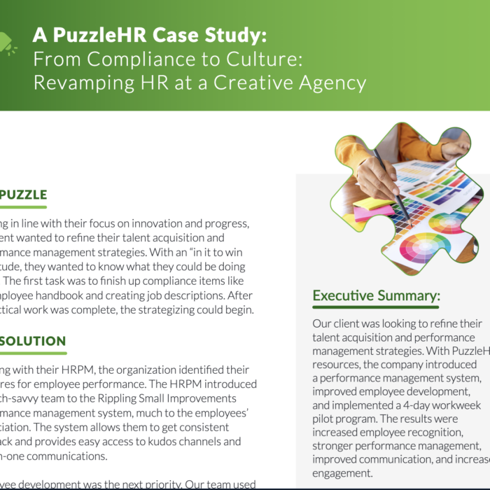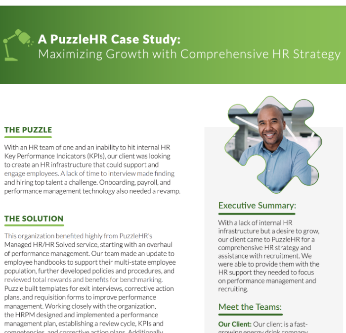 With a lack of internal HR infrastructure but a desire to grow, our client came to PuzzleHR for a comprehensive HR strategy and assistance with recruitment. We were able to provide them with the HR support they needed to focus on performance management and recruiting.